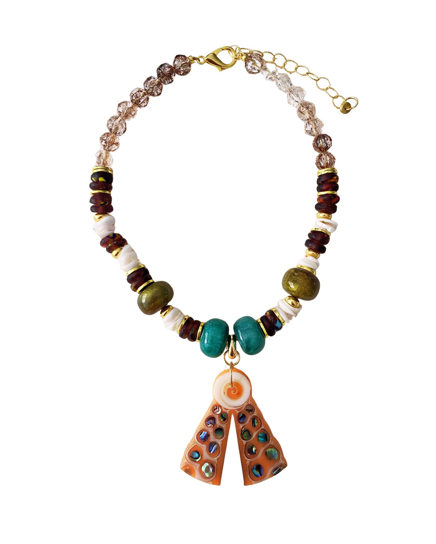 Collar corto con resina, cristal, madre perla y dije de resina con madre perla