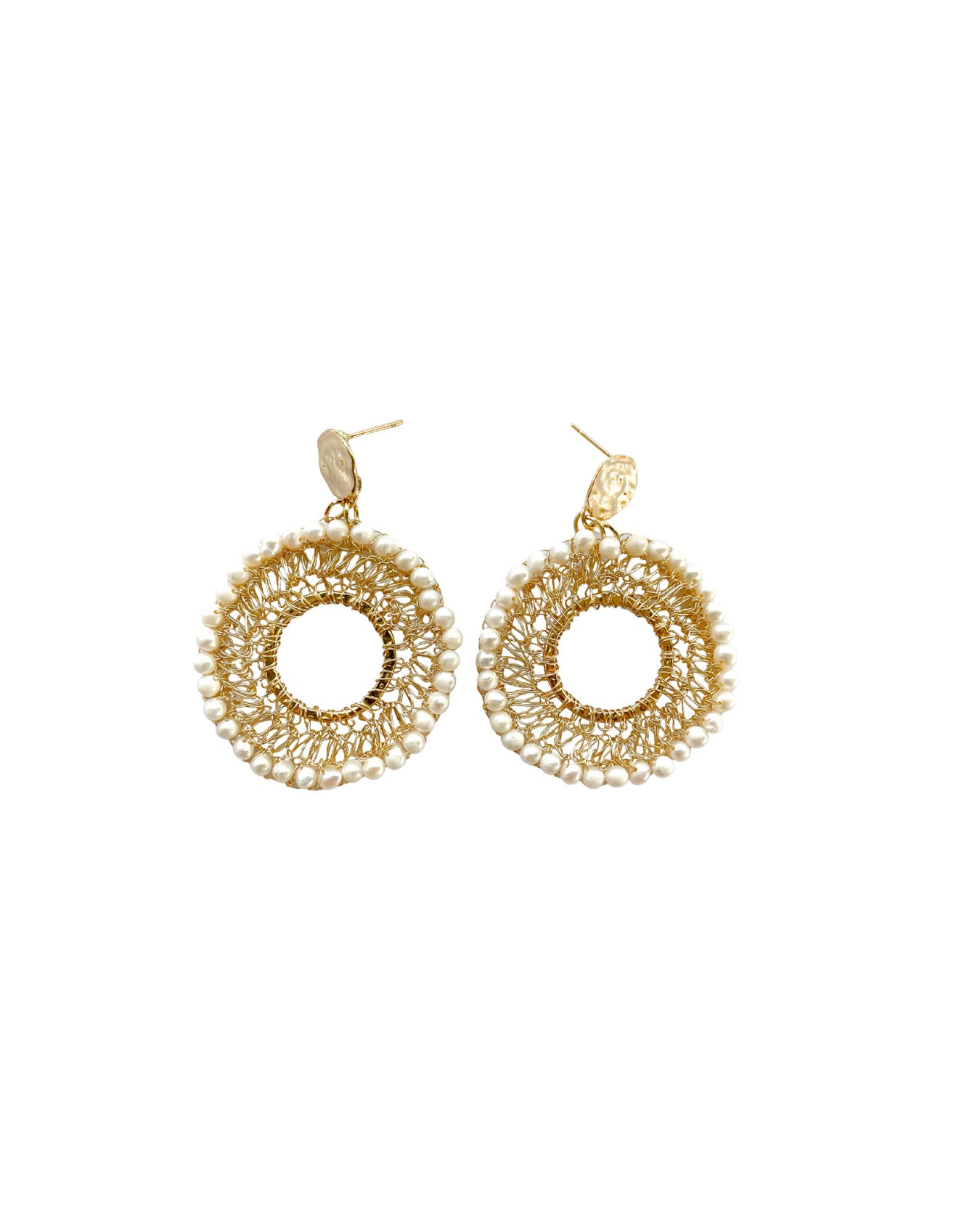 Arete tejido circulo mediano con hilo dorado con perlas.