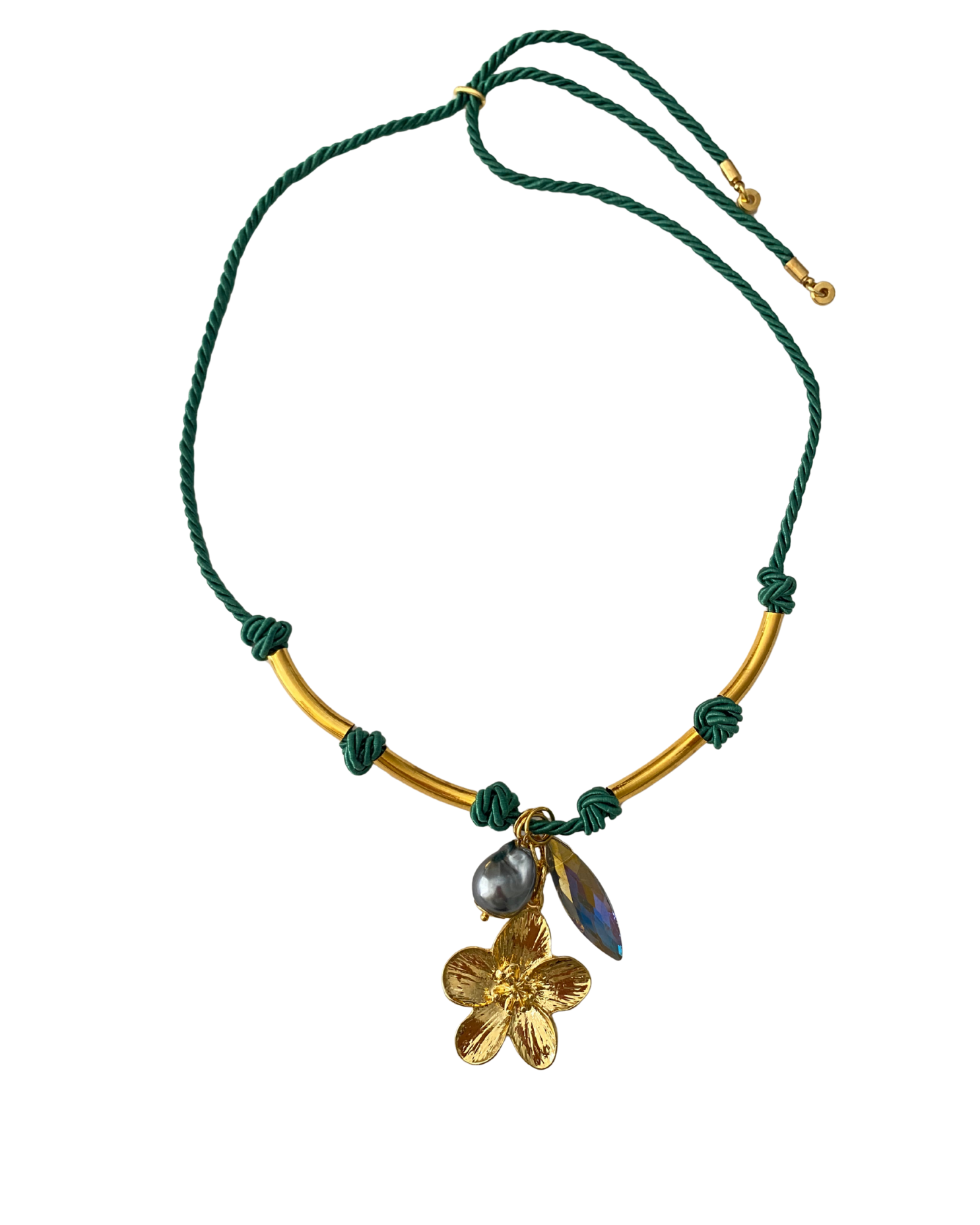 collar corto con cordón, dije flor, perla y cristal. Con tubos dorados.