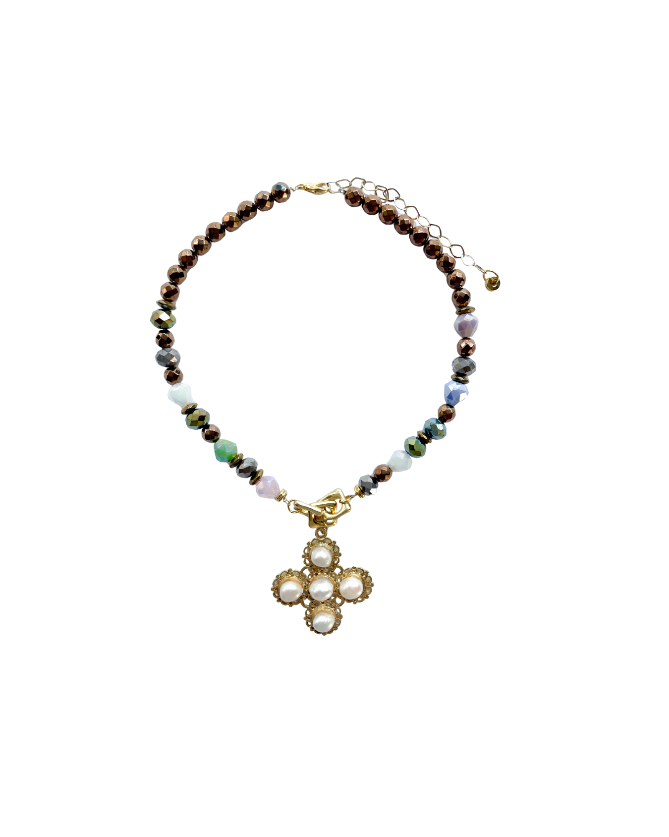 Collar corto ajustable con cadena, con piritas, cristal y dije de cruz con perlas