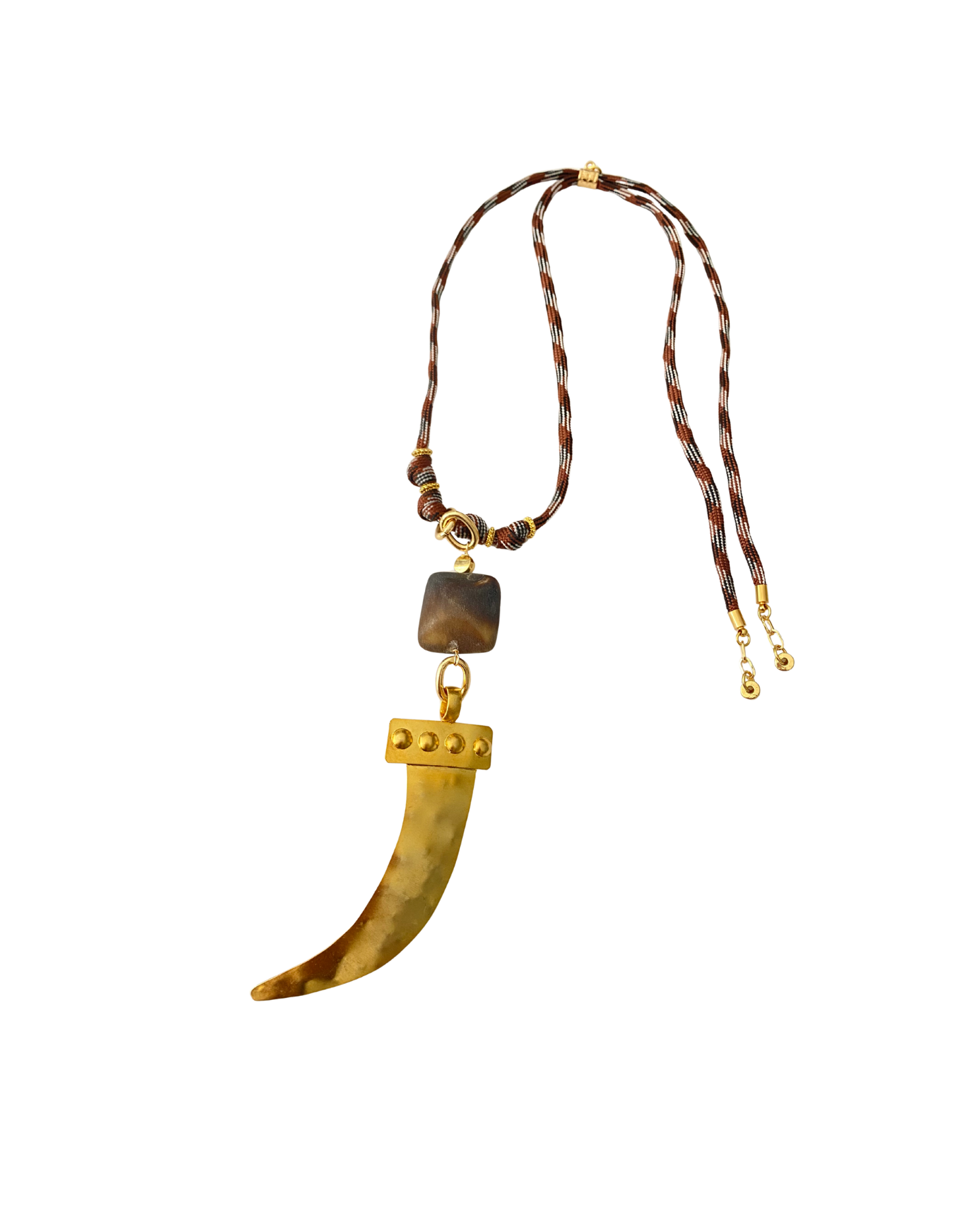 Collar largo ajustable con cordón, madera y colmillo dorado.