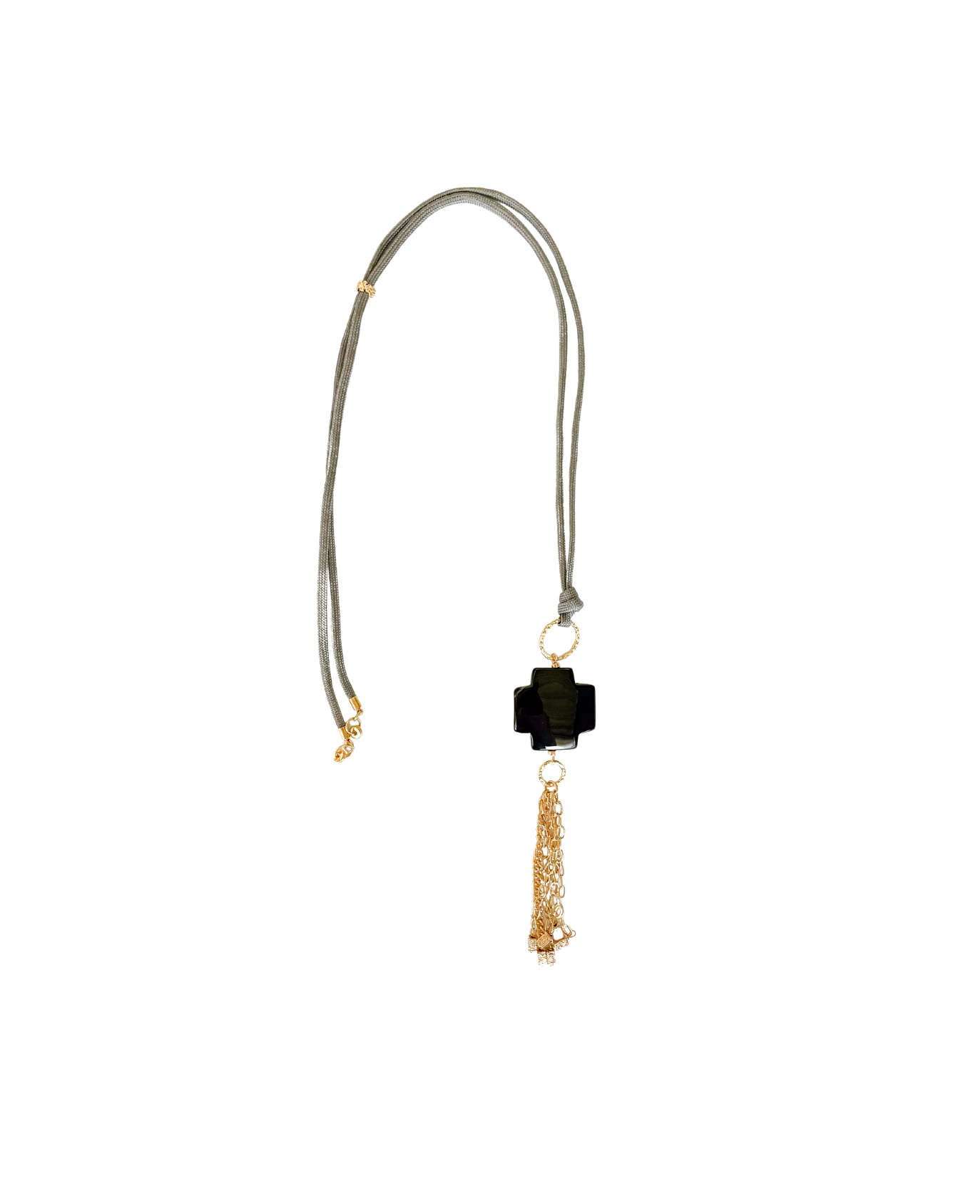 Collar largo ajustable con cordón, con dije de cruz de ágata y pompón de cadena