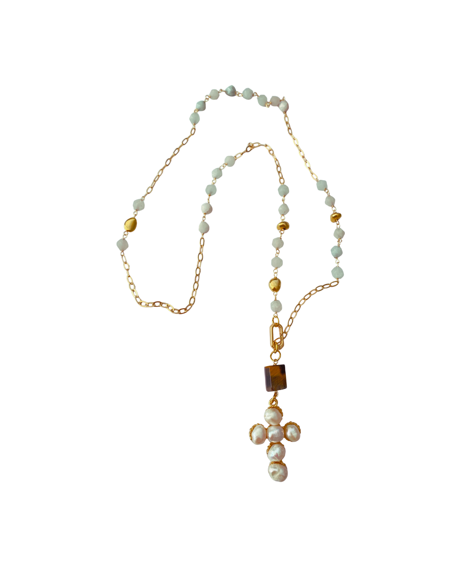 Collar largo con cuarzo, cadena, chips dorados, ojo de tigre y cruz de perla